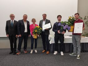Arno Carstensen, Vizepräsident der Landwirtschaftskammer, Dr. Frank Schoppa, Vertreter der gärtnerischen Berufsverbände sowie das Unternehmerehepaar Dorina und Christian Bahl mit ihrem Auszubildenden im 2. Ausbildungsjahr Pawel Kock und dem Ausbilder Josia Carl (v.li.). Foto: Frank Panhorst, Landwirtschaftskammer SH