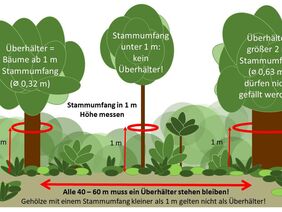 Definition Überhälter: Bäume ab 1 m Umfang gemessen in 1 m Höhe, dürfen auf den Stock gesetzt werden, wenn ein weiterer Überhälter im genannten Abstand stehen bleibt. Überhälter größer 2 m Stammumfang (Durchmesser 0,63 m) dürfen nicht gefällt werden.