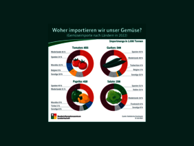 Mengenmäßig wichtigstes Importgemüse sind Tomaten. Im Jahr 2022 wurden 655.000 Tonnen nach Deutschland eingeführt – fast die Hälfte davon aus den Niederlanden. Tomaten sind das mit Abstand beliebteste Gemüse in Deutschland, aber nur etwa 13 Prozent der Frischware stammt aus heimischem Anbau. Nimmt man auch verarbeitete Tomatenprodukte hinzu, sinkt der Anteil sogar bis auf 3,5 Prozent.