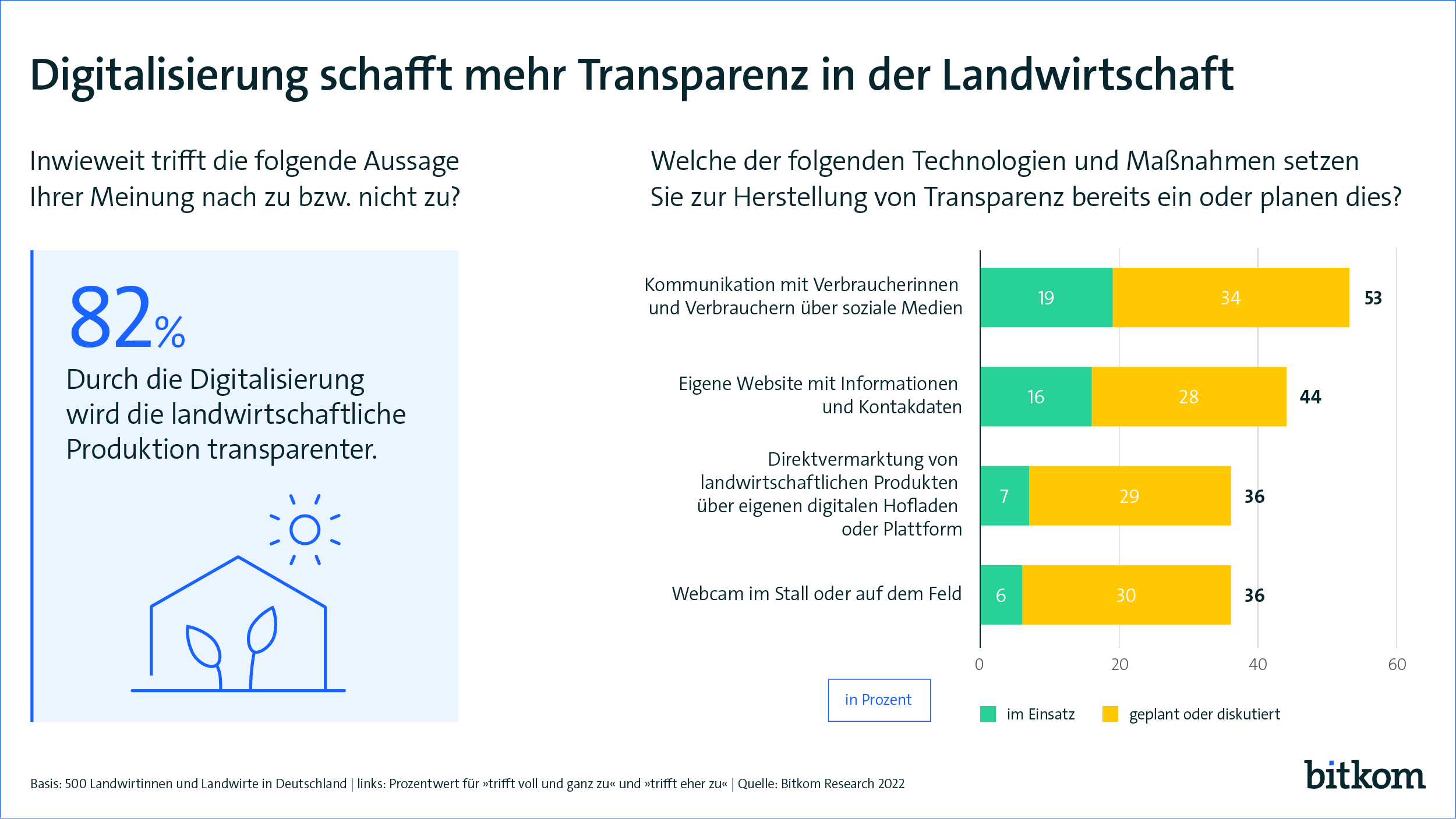 Demnach sind sowohl kleine Betriebe bis 49 Hektar (17 Prozent), mittlere bis 99 Hektar (22 Prozent) als auch große Höfe ab 100 Hektar (19 Prozent) über soziale Medien zu erreichen. Damit haben Social-Media-Profile bei Landwirtinnen und Landwirten einen höheren Stellenwert als die klassische Website, die jeder sechste Hof (16 Prozent) eingerichtet hat. Insbesondere die größeren Betriebe ab 100 Hektar (19 Prozent) stellen ihre Informationen und Kontaktdaten auf einer eigenen Website zur Verfügung – weniger die kleinen bis 49 Hektar (9 Prozent). „Vlogs, Fotos und Stories geben einzigartige Einblicke in die landwirtschaftliche Arbeit und helfen dadurch, die Wertschätzung für das Berufsfeld zu steigern. Gleichzeitig können Landwirtinnen und Landwirte ihre Produktionsbedingungen transparent darstellen und mehr Nähe zu den Verbraucherinnen und Verbrauchern aufbauen“, erklärt Andreas Schweikert, Bereichsleiter Landwirtschaft beim Bitkom. 82 Prozent der Landwirtinnen und Landwirte sind der Meinung, dass durch Digitalisierung die landwirtschaftliche Produktion transparenter wird. Eine weitere Maßnahme sind Webcams, die Einblicke in den Tierstall oder auf die Felder geben – 6 Prozent der Höfe haben solche Kameras schon installiert und bei 30 Prozent ist der Einsatz geplant oder wird diskutiert.