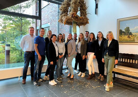 Es war ein Balanceakt, aber sie hängt, die Erntekrone 2023 des Kreislandjugendverbandes Plön. Alle freuen sich, mit ihnen Kammerpräsidentin Ute Volquardsen (vorn r.) und die Geschäftsführerin des Landjugendverbandes, Silke Meister (4. v. li.).