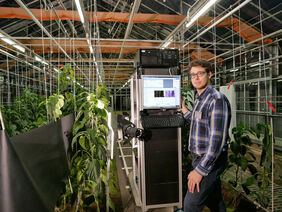Einen Einblick in die Gartenbau-4.0-Forschungen am Julius Kühn-Institut gewährten die Wissenschaftler Jelto Branding und Marvin Krüger. Sie demonstrierten den Gästen unter anderem einen Versuchsaufbau, der es ermöglicht, verschiedene Insekten an ihren Fluggeräuschen zu erkennen, sowie einen mobilen Messstand, der mit hyperspektraler Bildgebung den Gesundheitszustand einer Pflanze analysieren kann, ohne zuvor eine Blatt- oder Bodenprobe zu entnehmen.