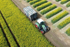 Was für ein Anblick! Mit Hilfe einer Drohne entstand dieses Foto von einer Rapsfahrt. Foto: Christoph Johannes Marten und Achim Seidel, Landwirtschaftskammer Schleswig-Holstein