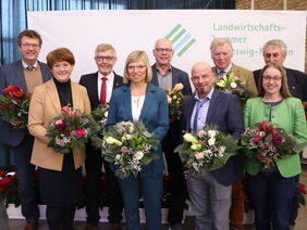 Der neue Vorstand der Landwirtschaftskammer: Jochen Flessner, Claudia Jürgensen, Vizepräsident Arno Carstensen, Kammerpräsidentin Ute Volquardsen, Dirk Eberlein, Carsten Schröder, Vizepräsident Hans-Caspar Graf zu Rantzau, Dagmar Wicklow, Heino Hansen (v. li.) Foto: Daniela Rixen