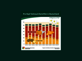 Bundesbürgerinnen und -bürger verbrauchten pro Person im Wirtschaftsjahr 2022/ 2023 vier Kilogramm weniger Speisefrischkartoffeln als im Vorjahr, insgesamt 16,2 Kilogramm pro Kopf. Der Verbrauch von Kartoffelerzeugnissen wie Pommes frites, Kartoffelsalat oder Chips nahm hingegen um mehr als zwei Kilogramm auf 37,9 Kilogramm pro Person zu. Der Gesamt-Verbrauch von Kartoffeln und Kartoffelerzeugnissen insgesamt sank damit auf 54,1 Kilogramm pro Kopf. Er ist seit 1990 um 28 Prozent zurückgegangen, da zunehmend Reis und Nudeln zum Einsatz kommen.