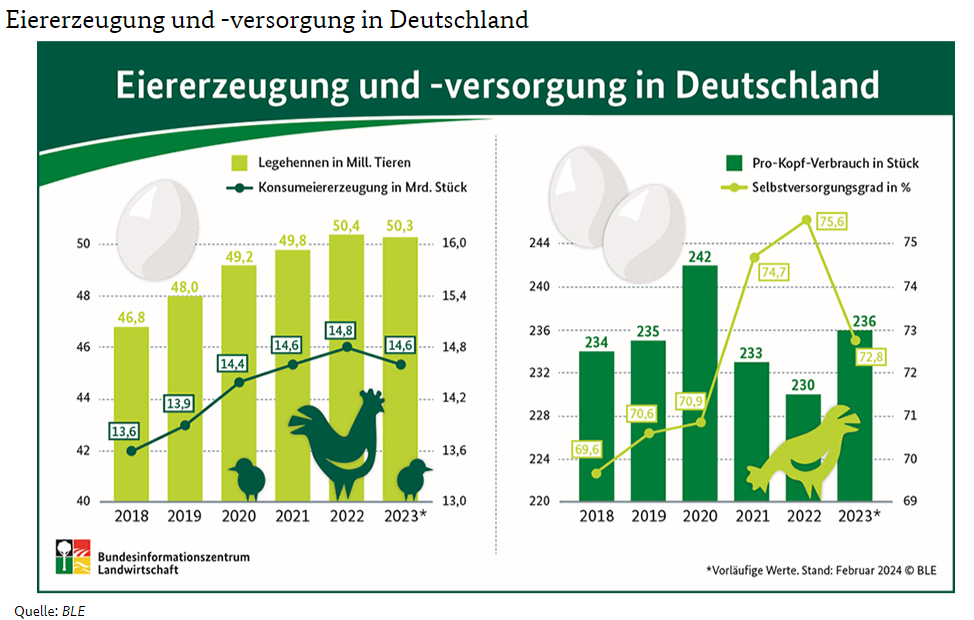 Nach einem Rückgang im vorletzten Jahr, ist der Eierverbrauch in Deutschland im Jahr 2023 wieder um 3% auf 236 Eier pro Person gestiegen. Ein Grund für den gestiegenen Verbrauch, könnte sein, dass die Verbraucher das Ei als günstiges Nahrungsmittel nutzen. Dazu kommt auch der Trend zur ‚bewussteren‘ Ernährung, nach dem Motto: weniger Fleisch, dafür unter anderem mehr Eier. Nach jüngsten Forschungsergebnissen, ist der Konsum von einem Ei je Tag für eine gesunde Person unbedenklich. Der Bestand an Legehennen in Deutschland ist im Jahr 2022 erstmals über 50 mio gestiegen und konnte sich auf diesem Niveau auch im Jahr 2023 behaupten. Bei einem leichten Rückgang der Legeleistung auf 291 Eier je Henne wurden im vergangenen Jahr 14,6 Mrd. Konsumeier erzeugt (-0,8 %). Zurückzuführen ist dieser leichte Rückgang auf den weiteren Ausbau der Haltungsformen mit Auslauf. Insgesamt konnte der Inlandsbedarf zu 73 % aus heimischer Ware gedeckt werden (-3 %). Durch den höheren Verbrauch stiegen die Importe um 6 % an. Die Kurse im Großhandelsgeschäft mit Eiern sind in den letzten Jahren kontinuierlich gestiegen. Besonders gefragt sind in Deutschland Eier aus Bodenhaltung. Hier stieg die Nachfrage in 2023 um 8,3 %. Der Absatz der Eier aus Freilandhaltung erhöhte sich um 4,0 %. Die Umsätze mit Bio-Eiern stieg in den zurückliegenden Corona-Jahren spürbar an. Im Inflationsjahr 2023 gingen die Verbrauchszahlen jedoch wieder um 6,0 % zurück. Der Umbau der Haltung der Legehennen begann in Deutschland im Jahr 2010. Seitdem werden die Hühner in Bodenhaltung (61%), Freilandhaltung (21%), Bio-Hühner (14%) und Kleingruppen (4%) gehalten. Die Aviäre Influenza (Vogelgrippe) bleibt nach wie vor ein Thema. In Schleswig-Holstein wurde diese Krankheit in den letzten Monaten immer nachgewiesen, was in einigen Regionen zur vorrübergehenden Stallpflicht geführt hat.