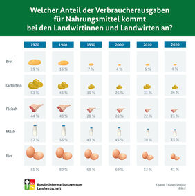 Ein immer geringerer Teil dessen, was Verbraucherinnen und Verbraucher für Nahrungsmittel bezahlen, kommt bei den Erzeugerinnen und Erzeugern an. Insgesamt betrug ihr Anteil an den Verkaufserlösen 2020 nur noch knapp 21 Prozent – 1980 lag er noch mehr als doppelt so hoch.