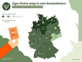 Statistisch gesehen gibt es jetzt genau 5,5 Jägerinnen und Jäger pro 1.000 Einwohner in Deutschland – ein Anstieg um 38 Prozent gegenüber 1994. Bezogen auf die Einwohnerzahl leben in Mecklenburg-Vorpommern die meisten Jagdscheininhaber, nämlich 10 pro 1.000 Menschen. Auf Platz 2 folgt Niedersachsen (9) und danach Schleswig-Holstein (8).