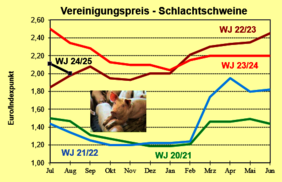 Zum Jahresbeginn lag der Vereinigungspreis bei 2,0 €/kg Schlachtgewicht (SG). Bis Ende Februar stieg die Notierung auf 2,20 €/kg SG. Dort verblieb der Kurs bis Mitte Juni. Dann setzte wieder Preisdruck ein. Bis zum 7. August gab der Kurs auf 2,00 €/kg SG nach. Die Schlachtbetriebe begründen den Preisrückgang mit einer ruhigen Nachfrage nach Schweinefleisch durch die laufende Ferienzeit. Die Nachfrage nach Grillartikeln vom Schwein hat sich in den Sommermonaten erhöht, es fehlt jedoch der Absatz der übrigen Fleisch- und Wurstartikeln. Dazu wird in der Ferienzeit weniger Ware an die Gastronomie und an die Kantinen abgesetzt. Die hiesigen Fleischvermarkter verweisen dabei zusätzlich auf günstige Fleischimporte aus den EU-Nachbarländern.