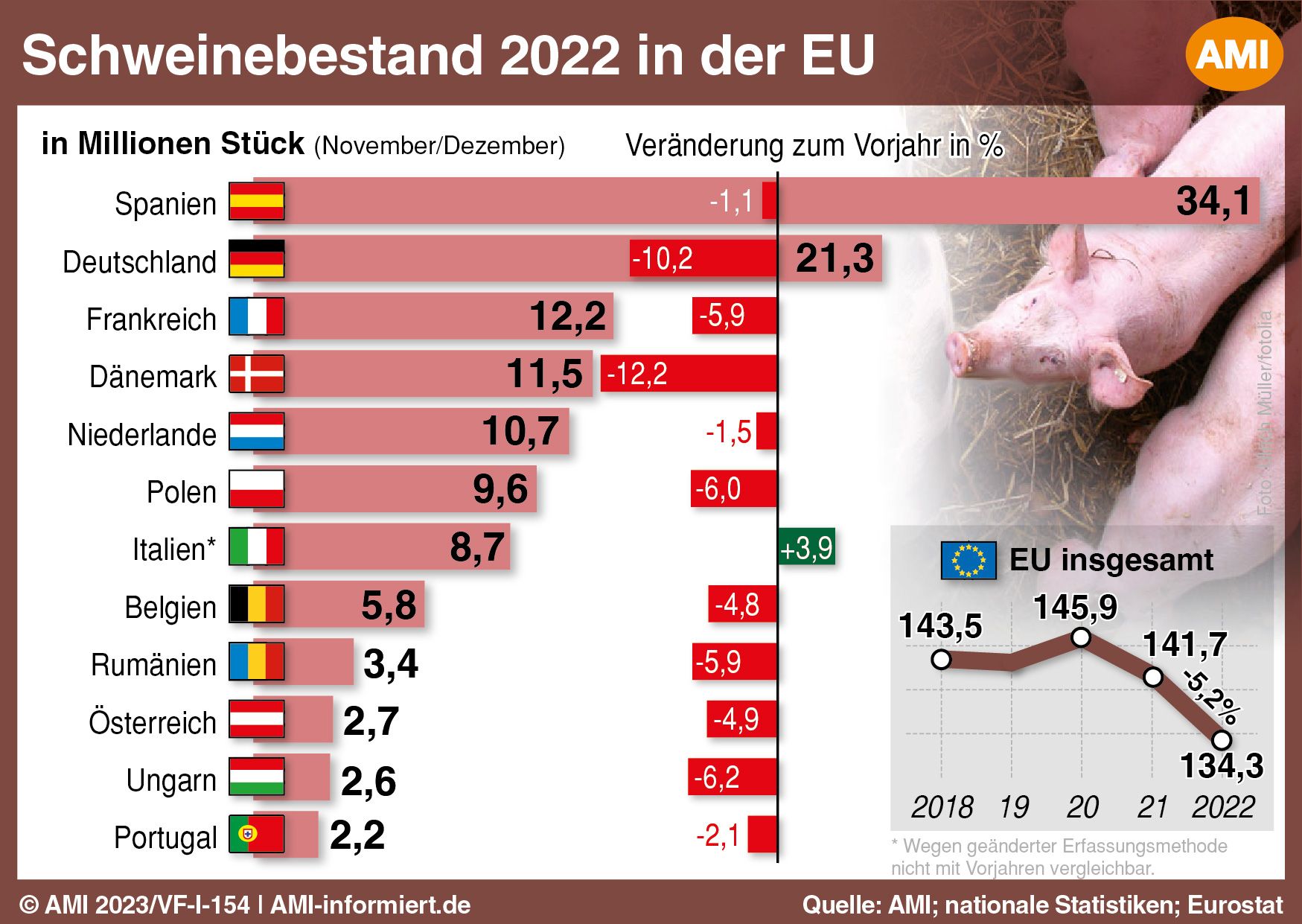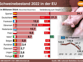 Deutlich gesunken sind die europäischen Schweinebestände. Das belegen die Ergebnisse der aktuellen Viehbestandserhebungen. Die Zahl aller in der EU gehaltenen Schweine verringerte sich innerhalb von einem Jahr um 7,4 Mio. Tiere. Spitzenreiter mit rund einem Viertel aller europaweit gehaltenen Schweine ist mit deutlichem Abstand Spanien, obwohl sich auch dort die Schweineherde leicht reduzierte. Die einzige Zunahme unter diesen Ländern bei Italien erklärt sich durch eine neue Erhebungsmethodik, dadurch sind die Ergebnisse nicht mit den Vorjahren vergleichbar.
