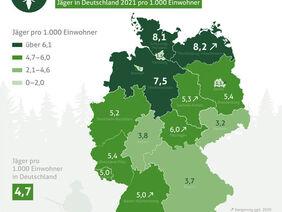 Bundesweit betrachtet leben 4,7 Jägerinnen und Jäger pro 1.000 Einwohner in Deutschland. Sie haben eine staatliche Prüfung abgelegt. Diese umfasst so unterschiedliche Bereiche wie Natur- und Tierschutzrecht, Fleischhygiene, Wildbiologie oder Waffenkunde. Etwa drei Viertel von ihnen sind in Verbänden organisiert und sorgen ehrenamtlich für die heimischen Wildtiere. Jägerinnen und Jäger reduzieren das Risiko von Wildkrankheiten, betreiben aktiven Arten- und Naturschutz und dämmen Wildschäden in Wald und Feld ein.