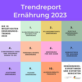 Auf den weiteren Plätzen finden sich die Trends Ernährung für den Darm, Bewusstsein für gesunde Ernährung, achtsame Ernährung, vegane Ernährung sowie alkoholfreier Genuss.