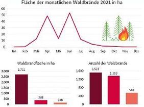 Die Frühjahrstrockenheit der letzten Jahre führte zu einer erhöhten Waldbrandgefahr im Frühling. Dies zeigt sich auch in der Brandstatistik 2021: Fast 80 Prozent der Flächen waren in den Monaten April bis Juni 2021 betroffen. Die meisten Brände gab es im Juni (186); fast ein Fünftel aller Brände entstanden im April (104).