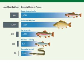 Regenbogenforelle und Karpfen dominieren nach wie vor die Liste der Speisefische aus deutscher Aquakultur, gefolgt von Lachsforelle, Elsässer Saibling und Europäischem Aal. In geringerem Umfang produziert die Teichwirtschaft weitere Fischarten wie beispielsweise Welse, Schleien, Zander oder Hechte.
