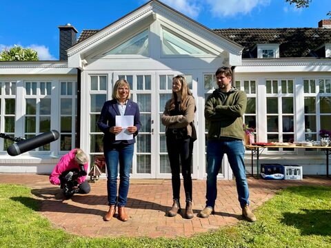 Kammerpräsidentin Ute Volquardsen hat am Vormittag mit Lena und Christoph Goldnick zum Saisonauftakt für Erdbeeren eingeladen.