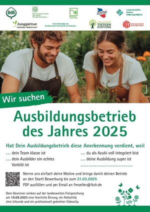 Mit der Auszeichnung zum „Ausbildungsbetrieb des Jahres“ im Beruf Gärtner/in wollen der Bund deutscher Baumschulen LV SH, Fachverband Garten-, Landschafts- und Sportplatzbau SH, Wirtschaftsverband Gartenbau Norddeutschland, Gewerkschaft IG BAU, Verein Ehemaliger Fachschulabsolventen, Junggärtner und die Landwirtschaftskammer SH in gemeinsamer Aktion das große Ausbildungsengagement im Gartenbau sichtbar machen.
