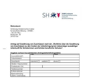 Die Unterbringungskosten müssen nachgewiesen werden. Der Antrag ist vor Beginn des ersten Unterrichtsblocks im Kalenderjahr, spätestens bis zum 30.11. einzureichen. Zuständig ist das Schleswig-Holsteinische Institut für Berufsbildung (SHIBB). Informationen und den Antragsvordruck finden Sie hier: