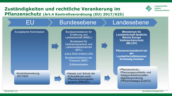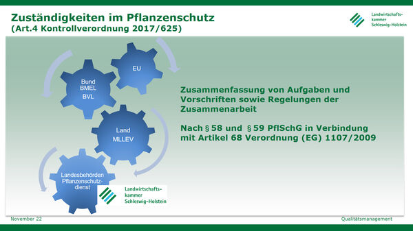 In Schleswig-Holstein ist die Landwirtschaftskammer zuständig für die Kontrollen und die Einhaltung der gesetzlichen Regelungen im Pflanzenschutz sowie die Umsetzung der neuen Vorgaben für den Pflanzenschutz aus der EU-Kontrollverordnung.