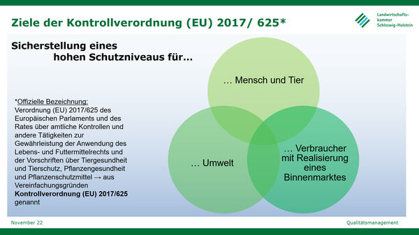Die Kontrollverordnung strebt eine Harmonisierung der Kontrollen innerhalb der EU an unter den Aspekten, das Schutzniveau für Umwelt, für Gesundheit, für Mensch und Tier sowie für Verbraucher sicherzustellen und den EU-Binnenmarkt zu beachten.