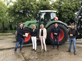 Landwirtschaftsminister Jan Philipp Albrecht freut sich über die EIP-Broschüre, die auf Gut Quarnbek im Beisein von Ute Volquardsen, Präsidentin der Landwirtschaftskammer, Carola Ketelhodt, Leiterin des Innovationsbüros EIP Agrar Schleswig-Holstein, Prof. Ives Reckleben, Projektleiter, sowie Betriebsleiter Gut Quarnbek, Peer Schoeller, vorgestellt wurde (v. li.). Foto: Daniela Rixen, Landwirtschaftskammer