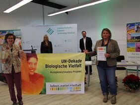 Landwirtschaftsminister Jan Philipp Albrecht überreichte die Trophäe und die Urkunde im Rahmen der Hauptversammlung der Kammer am 23. Dezember in Rendsburg an die Initiatorinnen des Projektes Heiderose Schiller und Maria Nielsen. Die beiden Beraterinnen der Landwirtschaftskammer haben das Projekt vor fünf Jahren ins Leben gerufen und eine bundesweit einmalige Qualifikation für Interessierte aus der Landwirtschaft geschaffen.
